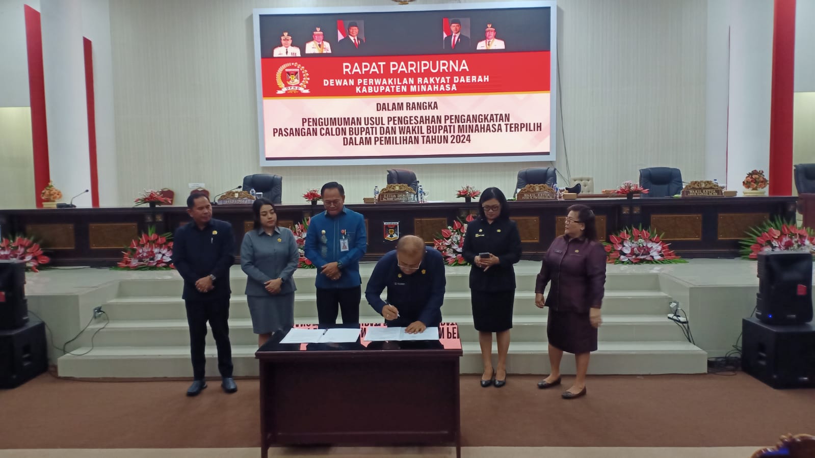 Setelah menerima salinan keputusan dan berita acara usai mengikuti rapat pleno terbuka penetapan calon Bupati dan Wakil Bupati terpilih dalam Pilkada 2024 yang digelar KPU Minahasa, maka dalam Rapat Paripurna hari ini, pasangan Bupati dan Wakil Bupati Minahasa, Robby Dondokambey – Vanda Sarundajang, diparipurnakan sebagai pemenang Pilkada Minahasa 2024. Untuk proses pelantikan menjadi kewenangan pihak Kementerian Dalam Negeri Republik Indonesia,” jelasnya.