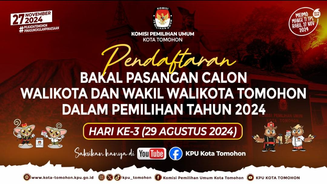 Hari ini, Kamis (29/08/2024), merupakan hari ketiga pendaftaran Bapaslon. Pertama adalah pasangan Carroll Senduk-Sendy Rumajar, dan selanjutnya pasangan Miky Wenur-Cherly Mantiri.
